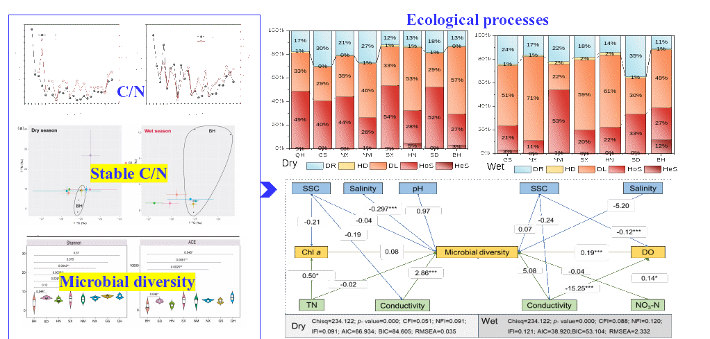 黃河泥沙在長(zhǎng)遷移過(guò)程中營(yíng)養(yǎng)鹽比例而發(fā)生明顯變化,其中碳氮比明顯降低,河南至河口段微生物群落組成幾乎沒(méi)有顯著變化,河口碳氮穩(wěn)定性同位素組成與河南樣品組成較為相似(圖4)。研究結(jié)果確定了黃河口懸浮顆粒物的來(lái)源于以河南樣品為主的下游懸浮泥沙;相關(guān)性分析發(fā)現(xiàn),鹽度、氮和透明度影響著水體微生物多樣性組成;隨機(jī)過(guò)程的分散限制在旱季和雨季的微生物群落組裝過(guò)程中均具有相對(duì)較高的重要性,確定性過(guò)程表現(xiàn)出更高程度的同質(zhì)選擇。