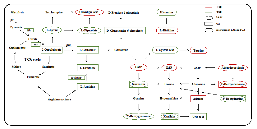 圖2 環(huán)境相關(guān)濃度混合抗生素(LAM)和海水酸化(OA)單獨(dú)/聯(lián)合暴露對海灣扇貝消化腺代謝過程的影響機(jī)制[2]