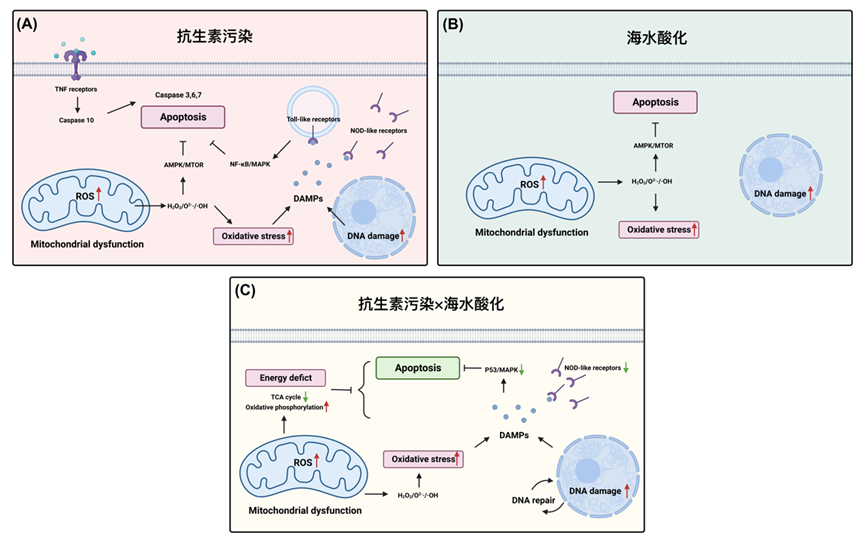 在近岸海域,海水酸化并非孤立存在,通常與海水升溫、痕量金屬污染和抗生素污染等其他環(huán)境壓力因素并存,對海洋生物產(chǎn)生復(fù)合脅迫效應(yīng),其引起的危害和風(fēng)險(xiǎn)更加復(fù)雜且難以預(yù)測。牟平站以經(jīng)濟(jì)貝類海灣扇貝(Argopecten irradians)為研究對象,揭示了近岸海域5種典型抗生素(磺胺甲惡唑、四環(huán)素、土霉素、諾氟沙星和紅霉素)和海水酸化聯(lián)合暴露對海灣扇貝消化腺代謝過程和血細(xì)胞凋亡過程的影響及其作用機(jī)制。二者的交互作用導(dǎo)致海灣扇貝消化腺組織中神經(jīng)遞質(zhì)組胺的相對含量降低,同時(shí)抑制神經(jīng)遞質(zhì)受體編碼基因的表達(dá),造成神經(jīng)信號傳遞過程受到負(fù)面影響[2](圖2)。另外,抗生素誘導(dǎo)的血細(xì)胞凋亡受到內(nèi)源性凋亡途徑(線粒體途徑)和外源性凋亡途徑的共同調(diào)控。海水酸化主要依賴線粒體途徑誘導(dǎo)血細(xì)胞凋亡,其中AMPK-mTOR信號通路對細(xì)胞凋亡的發(fā)生過程存在調(diào)控作用。二者的交互作用加重了血細(xì)胞內(nèi)線粒體功能障礙和氧化損傷,破壞了細(xì)胞內(nèi)能量代謝穩(wěn)態(tài),這可能在一定程度上限制了細(xì)胞凋亡的發(fā)生[3](圖3)。該研究為海洋酸化背景下,抗生素污染的風(fēng)險(xiǎn)評估提了供理論依據(jù)。