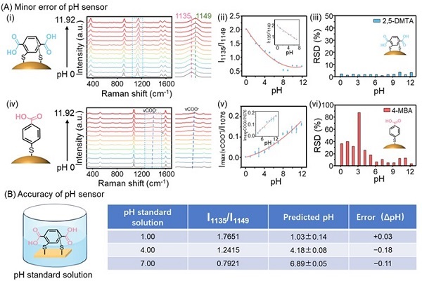 創(chuàng)新點(diǎn)一:設(shè)計(jì)了具有雙羧基pH響應(yīng)基團(tuán)的新型SERS探針2,5-DMTA。該探針在質(zhì)子化/去質(zhì)子化過程中所產(chǎn)生的光譜變化遠(yuǎn)優(yōu)于傳統(tǒng)單羧基探針4-MBA,能夠在pH 0–7的酸性范圍內(nèi)表現(xiàn)出優(yōu)異的線性響應(yīng)(R2 = 0.9786),顯著改善了4-MBA在強(qiáng)酸條件下響應(yīng)弱、誤差高(RSD ≈ 20%)的問題,將檢測精度提升至RSD < 5%,極大增強(qiáng)了酸性環(huán)境下的定量可靠性。